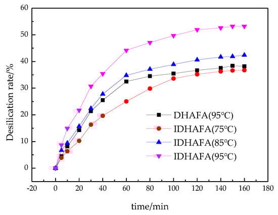 It can be seen from Figure 6 that the effect of temperature on the desilication efficiency is very large. Although the enhanced desilication rate is much higher than the direct desilication at 95 °C, the desilication rate is greatly reduced at 75 °C. In the 0–160 min period, the desilication rate increases with the increase of reaction time. However, as the reaction time increases, the reaction rate continues to decrease. The change of reaction rate divides the desilication reaction into two stages.