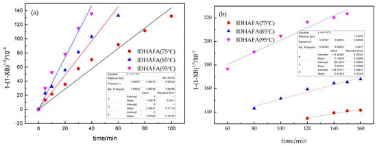 There are two stages in the traditional desilication reaction process; the earlier stage is limited by the surface reaction, while in the later stage, the internal diffusion on the solid product layer is the rate-controlling step []. But, the physical–chemical activation desilication is significantly different. As exhibited in Figure 7a,b, the desilication process was controlled by chemical reaction in 0–160 min, in the temperature range of 75–95 °C, and both stages are controlled by chemical reaction. Under experimental conditions, the kinetic equation can be written as