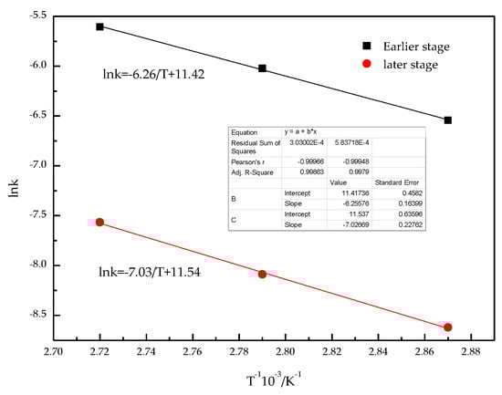 According to the Arrhenius equation lnk = lnA − Ea/RT, Plot lnk to 1/T, as exhibited in Figure 8, both of the two stages have a good linear relationship. Calculated based on the slope of the fitted curve, the earlier stage’s activation energy is 52.05 kJ/mol, the later stage’s activation energy is 58.45 kJ/mol.