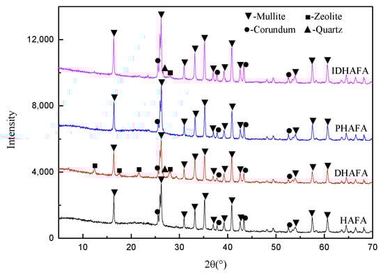 As shown in Figure 9, the phases of PHAFA and HAFA are basically the same, indicating that the physical–chemical activation process does not change the phase composition of HAFA. Moreover, according to the previous experimental results, the treatment only removed part of the iron oxide, calcium oxide, and a small amount of alumina; however, mullite, corundum, quartz, and glass-phase silica did not react, so there is no phase change before and after treatment. The bulge between 15° and 25° in the XRD patterns of both DHAFA and IDHAFA disappears because the activated amorphous SiO2 was dissolved by the alkali solution during desilication, and the new zeolite phase appears in DHAFA because the soluble alumina enters the desilication solution and reacts with sodium silicate. It is also observed that there are few zeolite peaks in IDHAFA because the amount of soluble alumina decreases during the activation process, weakening the spontaneous side reaction (zeolite).
