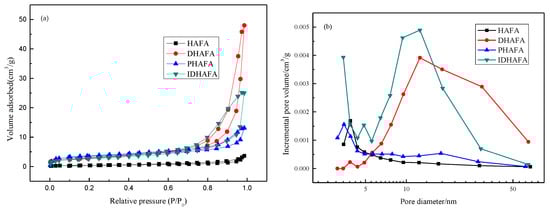 Nitrogen adsorption–desorption isotherms and pore size distribution of HAFA, DHAFA, PHAFA, and IDHAFA. (a) Nitrogen adsorption–desorption isotherms, (b) Pore size distribution.