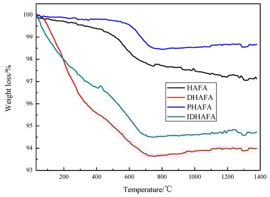 Figure 11 shows the weight loss curve under conditions of protective gas air atmosphere and heating rate of 10 °C/min. It is observed that both HAFA and PHAFA have smaller weight loss because there are small amounts of unburned carbon removed. On the other hand, DHAFA and IDHAFA show higher weight losses due to the formation of byproduct zeolite containing crystalline water. When the temperature is higher than 700 °C, no weight loss was observed. It should be noted that the weight loss of IDHAFA is still less than that of DHAFA, which also indicates that the pretreatment suppresses the occurrence of side reactions of fly ash after desilication and reduces the formation of zeolite.