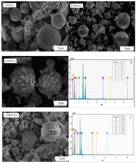 As demonstrated in Figure 12, the shape of the raw HAFA (Figure 12a) is more complicated. The spherical mullite and the irregular glass are intertwined and inlaid with each other, and the interface is not clear. After the conventional predesilication reaction, it is found that DHAFA (Figure 12c) is mainly composed of spherical mullite crystals, and the irregular glass phase essentially disappears. However, the spherical shape from the EDS analysis indicates that a large amount of the zeolite particles is covered, indicating a small amount of soluble oxidation in the conventional predesilication reaction. The aluminum reacted with sodium silicate solution re-enters DHAFA, resulting in a low desilication rate. After the physical and chemical activation treatment, it is observed that the mullite and the amorphous glass phase of PHAFA (Figure 12b) have been separated. This is highly beneficial for desilication. The surface of IDHAFA (Figure 12e) is smoother than the DHAFA (Figure 12c), and the particles in IDHAFA mainly consist of pure mullite crystals. Furthermore, the EDS analysis showed that the alkalinity of IDHAFA (Na 0.9 wt. %) (Figure 12f) is less than DHAFA (Na 2.39 wt. %) (Figure 12d), indicating that the side reaction of the zeolite (Na6Al6Si10O32·12H2O) was greatly reduced.