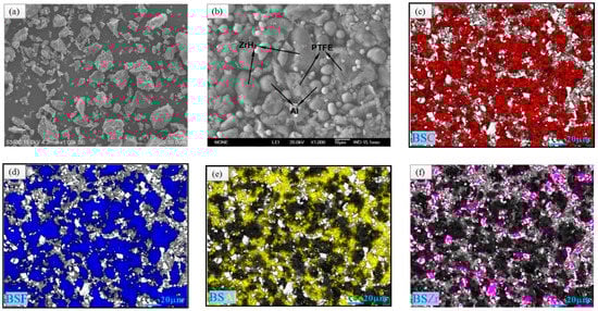 Figure 1 shows the original microstructures and element distributions of the materials by SEM to assess the homogeneity before cold pressing. Figure 1a–f were obtained by S-3400N II and FEI Versa 3D, respectively. The microstructure of pure ZrH2 power is illustrated in Figure 1a, showing the irregular shape of ZrH2 particles different from that of spherical Al particles. The overall interior microstructure of mixture 2# with 5% content of ZrH2 is illustrated in Figure 1b. There were many voids existing between the three particles. Al and ZrH2 distributed discretely and evenly in the PTFE matrix, respectively, and these could be discriminated facilely due to their spherical geometry. Figure 1c–f illustrate the distributions of the C, F, Al and Zr element. It was further observed that the Al, ZrH2, and PTFE powders were homogeneously mixed by the preparation process.
