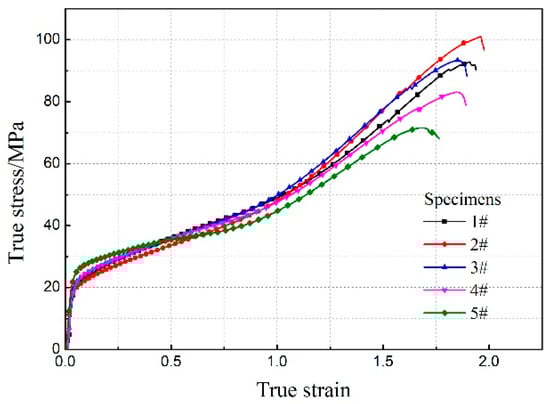 Figure 2 shows the true stress-strain curves of the five Al/ZrH2/PTFE composites; the corresponding mechanical properties are tabulated in Table 2. It can be obtained that the five types of specimens are all elastoplastic materials, which first underwent a short elastic deformation, reaching the yield point and then experienced the plastic deformation and showed the strain hardening phenomenon under quasi-static compression. The compressive strength of Al/ZrH2/PTFE increased first and then decreased as the content of ZrH2 increased from 0% to 30%. It reached the maximum of 101.01 MPa at 5% content of ZrH2, which increased by 8.78% compared with Al/PTFE specimens. However, the materials strength was lower than that of Al/PTFE when the mass fraction of ZrH2 was higher than 10%.