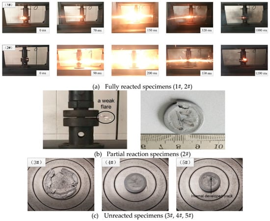 The reaction process of 1# and 2# under quasi-static compression are shown in Figure 3a. This figure suggests that the specimens first deformed and then suddenly reacted when the pressure reached the fracture strength of the specimens; then the specimens were deflagrated, releasing a considerable amount of black smog within 2–3 s. Feng et al. also found this reaction phenomenon in the study of Al/PTFE composites under quasi-static compression. The specimens, by a special treatment, underwent deformation, cracking, and violent chemical reactions, generating black smog and solid residues [22]. Besides, a special flame similar to gas combustion was observed in 2#, which contained 5% ZrH2. The partially reacted specimens are shown in Figure 3b. Under the similar compression conditions, the specimen cracked at the edge, with an initial reaction occurring at one of the cracks. More circumferential cracks with weak flares, and immediately the reaction extinguished. The specimens (3#, 4#, 5#) in Figure 3c, which failed due to the formation of developmental cracks inside [23], were not reacted at all.