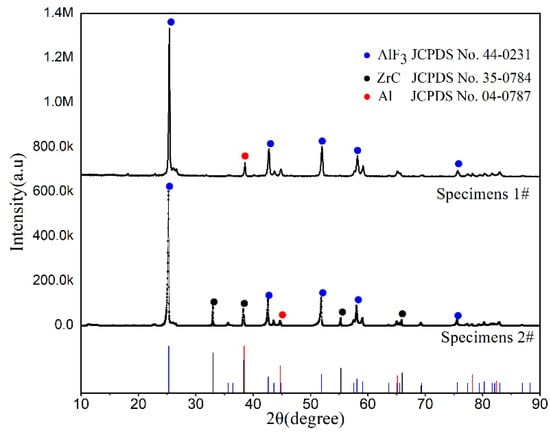 As shown in Figure 4, specimens 1# and completely reacted specimens 2# produced the black solid residues. The reaction residues were detected by XRD to explore the chemical reaction mechanism of Al/ZrH2/PTFE. The XRD patterns of residues are shown in Figure 5, suggesting that AlF3 was formed in the reaction residues of specimens (1#, 2#), and ZrC was generated in the reaction products of specimens 2#. Furthermore, there was no diffraction peak of ZrH2 in the XRD patterns, suggesting that–ZrH2 was fully involved in the reaction.