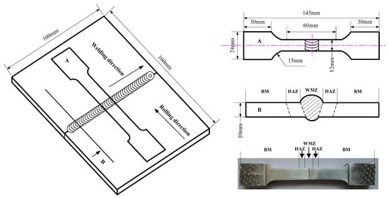 The welding sample dimensions were 100 × 80 × 10 mm3, and the edge of the specimens were welded along the longitudinal direction. The mechanical properties were tested at room temperature using a SHT-4605 universal testing machine (Shanghai SANS Measuring instrument manufacturing Co., Ltd., Shanghai, China), under a loading speed of 1 mm/min. The tensile tests were performed according to the Chinese GB/T 2651-2008 standard. A schematic illustration of the welded joint is shown in Figure 2. The mechanical properties of the samples were measured perpendicular to the axial direction of the weld, and the weld reinforcement of the front and back surface of the specimens was removed to reduce the stress concentration. The initial gauge length of each sample was 60 × 12 × 10 mm3. To ensure the reliability of the measured data, at least three specimens were tested for each condition. The macroscopic structure was observed using optical microscopy (Carl Zeiss AG, Oberkochen, German) after being treated by mechanical and electrical polishing, and then etching by the Keller solution of HNO3:HCl:HF:H2O = 2.5:1.5:1:95 (vol.%). The micro-area composition was observed by a Tecnai G2 F20 transmission electron microscope (TEM, FEI Company, Hillsboro, OR, USA). TEM specimens with a thickness of 1 mm were cut by wire cutting and mechanically polished to thick disks of approximately 60 μm. The final thinning was prepared by twin-jet electro-polishing in a mixture solution of 75% methanol and 25% nitric acid (vol.%) at approximately −25 °C and 15 V. The resistivity was measured at room temperature by a SIGMASCOPE SMP 10 conductometer (Linseis Messgeräte GmbH, Vielitzer, Germany), and electrical conductivity is the reciprocal of resistivity. The sample thickness was 3 mm and the diameter was 12 mm. The Vickers micro-hardness was measured using an HXD-1000TM microhardness tester (Shanghai Taiming Optical Instrument Co., Ltd., Shanghai, China) with an applied load of 200 g for 15 s.