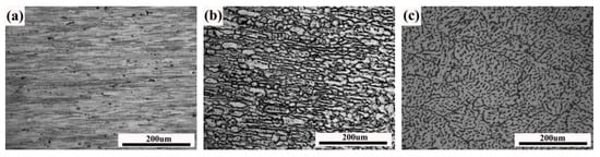 The optical microstructures of the 7075 aluminum alloy PVPPAW joint can be seen in Figure 3. As it can be observed from Figure 2, the welded joint consists of a base metal (BM) zone, a heat affected zone (HAZ), and a weld metal zone (WMZ). As shown in Figure 3, the BM exhibited a typical rolling microstructure, the HAZ showed an equiaxed grain shape, and the WMZ consisted of coarse dendrites. The morphology of the microstructure is closely related to the heating state and physical characteristics of the aluminum alloy during welding. The PVPPAW method has a high energy density and fast welding speed. The WMZ is the center of the heat input, leading to a small temperature gradient. The fact that the duration at high temperature was longer and the grain growth time was abundant resulted in the formation of a dendritic structure in the WMZ. The temperature of HAZ was increased by the heat dissipation, which reached the recrystallization temperature of the BM, and thus partially equiaxed grains were formed by recrystallization of the rolled structure. The microstructure of the BM was unchanged.