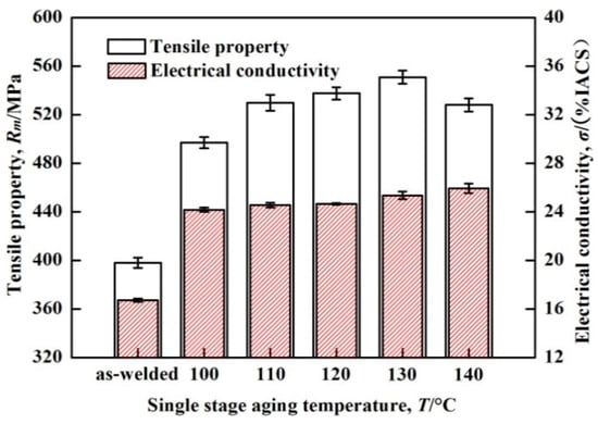 However, the tensile strength of the welded joint at 140 °C decreased slightly compared to that at 130 °C. According to Figure 4, the tensile strength of the welded joint was evidently improved by single-stage aging. Moreover, the electrical conductivity increased slowly when the temperature was between 100 °C and 120 °C, but increased rapidly when the temperature was further increased. The electrical conductivity of the as-welded joint was 17% IACS at room temperature, and it increased from 22% IACS at 110 °C to 26% IACS at 140 °C. It can be seen that the stress corrosion resistance of the welded joints increased with the increase of the single-stage aging temperature []. Based on the tensile strength results, the optimum aging temperature was 130 °C. The same trend was also observed in the results of the welded joints microhardness.