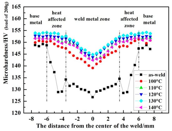 Figure 5 shows the microhardness distribution of the welded joints at different temperatures for 24 h with a load of 200 g for 15 s. As it can be observed, the microhardness initially increased, and then, as the temperatures increased, it decreased. The microhardness of the weld center increased from 127 HV of the as-welded joint to 145 HV of the joint heat-treated at 130 °C. After single-stage aging, the microhardness of the weld center was still the smallest, much lower than that of the BM, and the microhardness of the HAZ was significantly enhanced. The highest microhardness values of the weld center and the HAZ were obtained when the temperature was 130 °C.