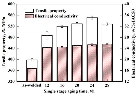 The variation of tensile strength and electrical conductivity of welded joints at 130 °C for different single-stage aging times can be seen in Figure 6. With the increase of the single-stage aging time, the tensile strength of the welded joint initially increased and then decreased. The tensile strength of the welded joint was 482 MPa after being aged for 12 h, while the maximum tensile strength was 551 MPa after 24 h. The electrical conductivity of the welded joints increased with the increase of aging time. After 24 h, the electrical conductivity reached 24% IACS, and then, after 28 h, increased to 26% IACS. Based on the tensile strength results, the optimum single-stage aging time was 24 h.