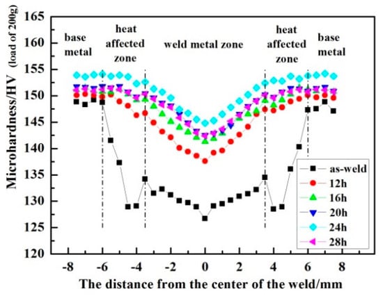 Figure 7 shows the microhardness distribution of the welded joints at 130 °C for different times with a load of 200 g for 15 s. As it can be observed, the microhardness of welded joints initially increased, and then, as the aging time increased, it decreased. The microhardness of the weld center was 138 HV after 12 h and increased to 145 HV after 24 h of aging. As the aging time increased, the microhardness decreased to 143 HV. After single-stage aging treatment, the microhardness of the weld center was higher than that of the as-welded joint. The microhardness of the HAZ was evidently improved, but it was still lower than that of the BM. The highest microhardness values of the weld center and HAZ were obtained after 24 h of aging.