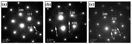 In Figure 8, TEM images of the welded joints at different single-stage aging temperatures for 24 h are demonstrated. As it can be seen in Figure 8, the precipitation phase was formed in the grain interior at different temperatures. In addition, typical TEM images with corresponding selected area electron diffraction (SAED) patterns of precipitates are displayed in Figure 9. Based on the analyses, a kind of weak spot appeared at the 1/3 {022} position in the diffraction pattern taken along the [011] zone axis and at the 2/3 {220} position in the diffraction pattern taken along the [001] zone axis. These spots were identified as η′ and η phases, the chemical composition of MgZn2 [,,]. There were no extra spots other than those in the α-Al matrix, suggesting the presence of fine precipitates in the aged specimen, which can be seen in Figure 8a, where the Guinier-Preston (GP) zone precipitates have the same crystal structure as the matrix []. As it can be observed in Figure 8a, the particle size of the η′ phase was very small and its distribution was uniform. Furthermore, in Figure 8b, the size of the η′ phase increased slightly at 130 °C for 24 h, while its density increased significantly.
