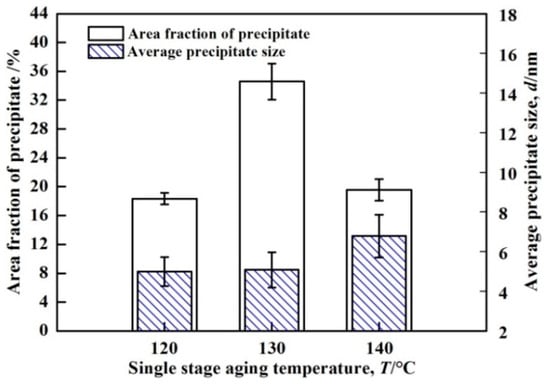 After aging at 140 °C for 24 h, the density of the precipitated phase was smaller than that at 130 °C. As it can be seen in Figure 8c, the η′ and η phase in the grains’ interior were coarsened remarkably. Moreover, in the analysis of the diffraction pattern taken along the [011] zone axis by the schematic diffraction pattern of Refs. [,], the η′ phase was found to transform to η phase after aging at 140 °C. Due to the difficulty in quantitatively measuring the accurate precipitate size and area fraction from Figure 8, the average precipitate size and area fraction under three different aging temperatures were semi-quantitatively measured [] and the results are presented in Figure 10. The qualitative comparison of these results indicated that the average precipitate size and area fraction of the precipitates at 130 °C appeared to be smaller and higher than those at the other two temperatures, respectively. The shape of the precipitates was spherical and plate-like, while the average precipitate size was approximated from the average measurements on the long and short axes of the precipitates. As it can be seen in Figure 10, at 120 °C, the fine precipitates were in the size range of 4–6 nm, with an average precipitate size of 5 nm and an area fraction of 18.3%. With the increase of temperature to 130 °C, the average precipitate size remained in the range of 4–6 nm, with an average precipitate size of 5 nm, while the area fraction increased to 34.6%. Then, at 140 °C, the average precipitate size increased to a size range of 5–8 nm and the area fraction decreased to 19.6%.