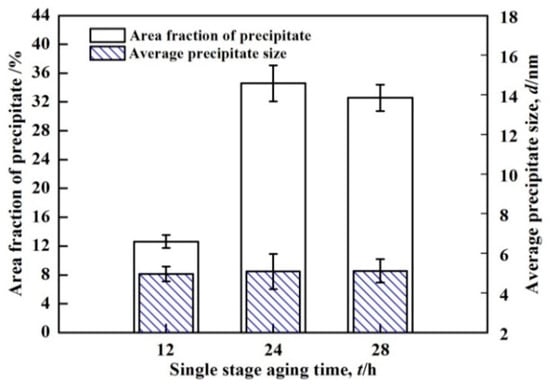 (2) The change rules of precipitation under different aging temperatures and times were analyzed. A large number of the η′ phase precipitated during the aging treatment. The area fraction was initially increased with the increase of temperature and time, and then decreased, while the average precipitate size was slightly increased with the increase of the aging temperature, but no obvious change was observed with the increase of the aging time.