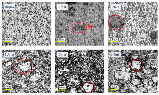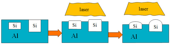 Since aluminum alloys are soft and have a certain viscosity, the plastic flow of aluminum easily occurs on the surface during friction, resulting in a weaker wear resistance of Al-Si liners than cast iron cylinder liners [12,13]. Therefore, surface treatments are needed to improve the wear resistance [14,15,16,17]. Li et al. founded that the chemical etching method could expose the silicon, they researched the etching time on the wear behaviors of etched surface using a self-designed reciprocating wear machine and explored the wear mechanisms [18]. Riahi et al. pointed out that chemical etching could improve the scuffing resistance of Al-Si alloy, and the best scuffing resistance was achieved after an etching time of 7 min [19]. Das et al. slid a steel ball on Al-Si flats, they found that the etched surface hardened the alloy and gave rise to silicon particles, and the plastic deformation was initiated at a load much higher than that of the unetched Al-Si alloy [20]. However, chemical etching pollutes the environment and the edges of the exposed silicon particles are sharp. During the friction process, the sharp edges of Si particles are more likely to cause stress concentration than that of the rounded edge, so it may relatively result in a higher wear loss of the Al-Si alloy than the ones with rounded Si particles.