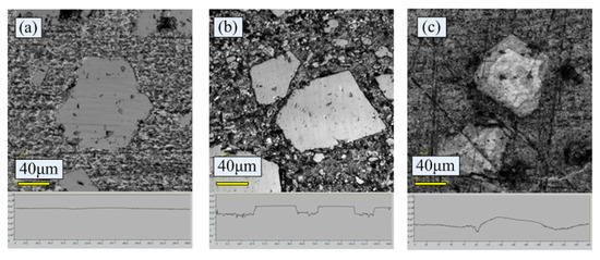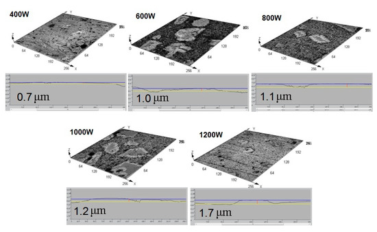 Figure 6 shows the schematic diagram of laser finishing process. The high temperature of laser causes the aluminum layer on the surface of the cylinder liner to melt and evaporate, which exposes the silicon particles. The melting point is higher for the silicon particles than the aluminum matrix. Therefore, the silicon particles melt after the aluminum matrix and when the aluminum melts and evaporates, the exposed silicon particles begin to melt in the convex corners. The laser has instant heating and instantaneous cooling, so the silicon particles are rapidly cooled after being melted, and due to the lowest surface energy principle, the silicon particles are rounded by the surface tension, which reduce the surface energy during the melting and re-cooling molding process. On the premise of a certain material removal rate, a certain surface quality is ensured and free of burrs. The rounded profile of silicon particles can be seen in Figure 5c. The change in the laser power affects the protrusion height of the silicon particles, which also affects the friction performance. Figure 7 shows the surface morphologies and outlines of the Al-Si alloy cylinder liner with different laser power. The protrusion height of the silicon particles increases from 0.7 μm to 1.7 μm with the increase of laser power.