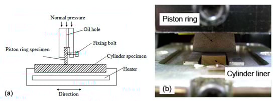 Tribotests are conducted on a reciprocating sliding tribotester as shown in Figure 8. The piston ring sample is fixed in the jag of the upper holder, while the cylinder liner sample is fixed in the heat block, which is dragged by a motor through wheel and nod. The reciprocating stroke length is 30 mm. The tribotester can accommodate a wide range of speeds (5–500 r/min), loads (5–380 MPa), and temperatures (30–300 °C) between the piston ring and cylinder liner. The model parameters used in this study are determined by a large number of previous experiments to simulate the wear performance of the piston rings and cylinder liners under boundary lubrication conditions. The load consisted of two stages, which are running-in stage and steady stage. The first stage is a low load of 5 MPa for 1 h to reduce the effect of burrs on the test repeatability; the second stage is a high load of 20 MPa for 4 h because the maximum explosion pressure of the diesel engine is about 20 MPa. To simulate the surface temperature of the cylinder liner when the first piston ring is near the top dead center (TDC), the test temperature is set to 150 °C. In order to ensure the boundary lubrication state and consider the wear efficiency, the speed is selected as 200 r/min. The lubricating oil is RP-4652D (15W-40/CF-4), which is supplied at a speed of 0.1 mL/min. By the pre-experiments and contact resistance method, the oil film thickness ratio near the top dead center is calculated to be about 0.8 under the condition of this parameters, and the friction coefficient is between 0.1 and 0.15, which is generally considered to be in the boundary lubrication state. Each test is repeated four times to obtain a stable result.