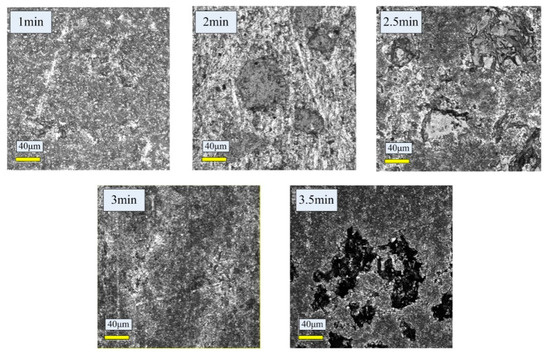 Figure 4 shows the surface topographies of the etched Al-Si cylinder liner after different etching time by a Philips-30TMP scanning electron microscope (Philips, Amsterdam, The Netherlands). The aluminum is etched by the solution, resulting in the silicon particles being protruded on the surface; the protrusion height of silicon increases with the increase of etching time.