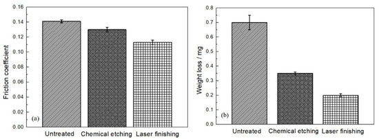 The weight loss results exhibit the same trend as the friction coefficient; the weight loss is lowest for the laser finishing treatment at 0.2 mg. The surface of the cylinder liner after chemical etching is sharp and easily breaks when applying friction. Abrasive grains are formed and scour the surface, resulting in higher weight loss than for the laser finishing treatment.