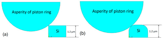 The contact wear models of the piston ring and the chemically etched and laser-finished cylinder liners are created to compare the contact stress of the silicon particles in a static state, as shown in Figure 14. Most scholars have studied the asperities and assumed that the asperities shapes are hemispherical (3D) or semicircular (2D) [30,31]. This work also assumes that the piston ring asperities are semicircular. The material property parameters are shown in Table 2.