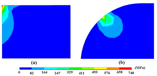 Contact stress distribution of silicon particles at the contact areas. (a) Chemical etching model; (b) laser finishing model.