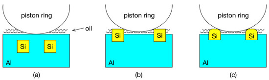 Aluminum-silicon (Al-Si) alloy materials was widely used for the energy-saving design of small and medium power engines, given its characteristics of being light weight, and having good thermal conductivity and a high recovery rate [1,2,3,4,5,6]. Ye reported the development of aluminum-silicon (Al-Si) alloy for engine application and focused on improving the material’s fatigue limit and wear resistance. Some techniques such as alloying, composite production and casting are also discussed [7]. Elmadagli et al. researched the relationship between the microstructure and wear resistance of Al-Si alloys under dry conditions, they believed that the effect of the individual contribution of each microstructural feature on the wear resistance could be isolated [8]. Chen et al. conducted experiments using a pin-on-disk tester and researched the wear resistance of Al-Si alloys for a boundary-lubricated contact, and founded that the silicon particles standing exposed of the aluminum matrix would present good wear resistance [9]. Slattery et al. studied the microstructure evolution of a eutectic Al-Si engine under severe conditions and researched the subsurface deformation in a liner-less Al-Si engine [10,11].
