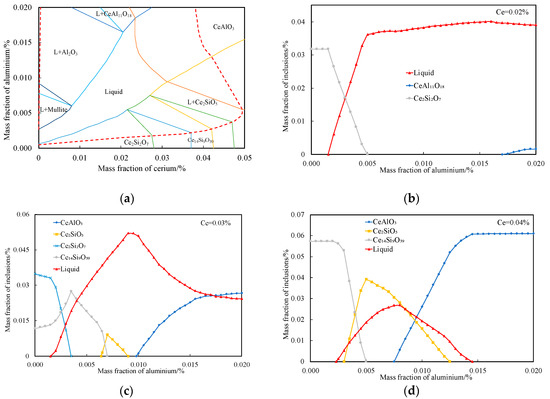 Calculation results by developed thermodynamic package. (a) Liquid regions of inclusions; (b) Effect of aluminum addition on inclusions, wCe = 0.02%; (c) Effect of aluminum addition on inclusions, wCe = 0.03%; (d) Effect of aluminum addition on inclusions, wCe = 0.04%.