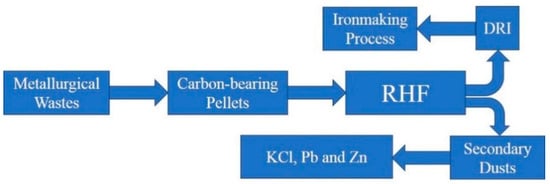 Large amounts of waste are generated in ironmaking and steelmaking processes, such as sinter dusts, blast furnace dusts and converter dusts. These wastes are valuable because they contain Fe and C. Adversely, these dusts are not directly used in blast furnace production because they contain high levels of Pb, Zn, K and Na, which are harmful to blast furnace production. The direct reduction of the ironmaking process of rotary hearth furnace (RHF) is an effective method for the treatment of metallurgical wastes and it has received significant attention [,,,]. Five RHFs for the treatment of metallurgical wastes have existed in Kimtsu, Hikari and Hirohata in Japan since 2000 [,]. In China, the Laiwu Steel, the Maanshan Iron and Steel, the Shangan, the Rizhao Iron and Steel and other enterprises have built RHFs for dealing with metallurgical wastes. Usually, the wastes are turned into carbon-bearing pellets, from which C is effectively utilized for the reduction of metal elements. Pb and Zn through the reduction and re-oxidation into the gas phase form the secondary dust. KCl will volatilize into the gas phase and Fe will form direct reduced iron (DRI). Zn, Pb and KCl are obtained through the secondary dust treatment. The DRI can be used for Blast furnace process as confirmed by She []. Through the RHF process, the separation of harmful elements and Fe is achieved, in order for the metallurgical wastes to be effectively utilized.