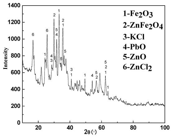 The chemical composition of the deposition and the XRD results are given in Table 1 and Figure 3. According to Table 1 and Figure 3, it could be observed that the deposition product was mainly composed of ZnO, PbO, KCl, Fe2O3, ZnCl2 and ZnFe2O4. The ZnO and PbO were derived from the reduction and re-oxidation of Zn and Pb in the carbon-bearing pellets. The KCl was volatilized directly from the carbon-bearing pellets in the high temperature furnace of the RHF. The ZnCl2 was not present in the carbon-bearing pellets, while its formation was more complicated. The Cl in ZnCl2 was derived from KCl. The key to the formation of ZnCl2 was the decomposition of KCl. Certain studies demonstrated that the corrosion of pure iron in oxidizing atmosphere with KCl vapor could result in the following reaction [,,]: