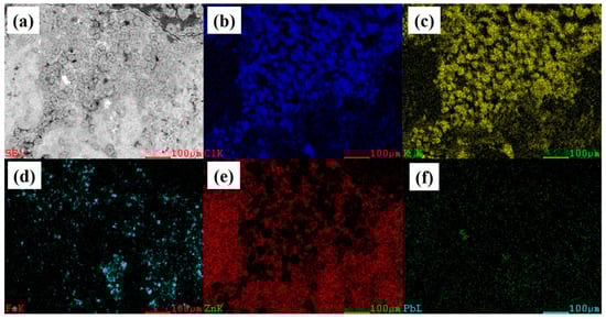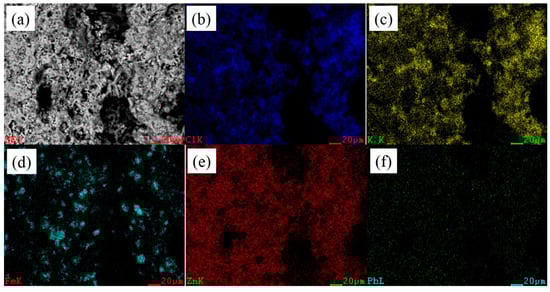 EDS maps results for porous areas. (a) EDS map; (b) Cl; (c) K; (d) Fe; (e) Zn; (f) Pb.