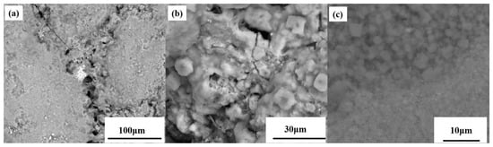 Certain filled holes were found on the deposition product surface, as presented in Figure 7a. Following the hole interior enlargement, it was observed that the walls of the hole were covered with molten KCl and cubic KCl particles began to appear (Figure 7b). This was similar to the transitional areas, but these particles were not completely crystallized, compared to the particles of KCl in the flat areas (Figure 7c).