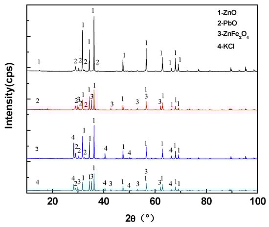The XRD results of samples of 1–4 groups of experiments in Table 2 are shown in Figure 8. The phases in sample 1 were PbO and ZnO. In addition to the PbO and ZnO phases, ZnFe2O4 was present in sample 2 due to the addition of Fe2O3 component to sample 2. Three phases of PbO, ZnO and KCl were present in sample 3, while in sample 4, four phases of PbO, ZnO, KCl and ZnFe2O4 were present. In the 1–4 groups of experiments, the sample 1 was still powdered following cooling, while the samples in groups 2–4 were bulk after the samples were cooled. Through the XRD results, it could be observed that the mixture of ZnO and PbO did not produce any new compound subsequently to heating, signifying that no cohered phase existed. Therefore, the sample of experiment 1 was still powdery following cooling. The ZnFe2O4 phase appeared in the sample of experiment 2, while it was possible that the ZnFe2O4 would bind the other powders together. In experiment 3, although no new compound appeared, the melting point of KCl was low, while the particles of the other substances were adhered to each other during the solidification of KCl. Also, sample 4 presented a result of the combined effect of KCl and ZnFe2O4. From the 1–4 group of experiments, KCl and ZnFe2O4 produced the effect of bonding.