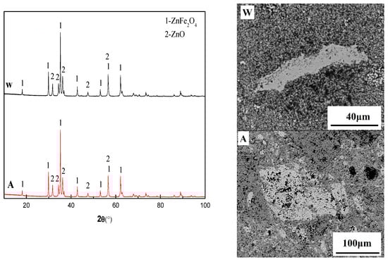 Figure 9 presents the XRD and SEM results of the two samples in experiment 5, where the water quenched sample was denoted as W and the sample cooled in the air was denoted as A. From the XRD results of the two samples, the ZnFe2O4 could be completely crystallized under the conditions of rapid cooling in water or slow cooling in the air. This result indicated that the ZnFe2O4 was solid when it formed and that the melting point of ZnFe2O4 exceeded 1200 °C. Therefore, the mechanism of ZnFe2O4 formation reaction was obtained, as presented in Equation (6). Through the FactSage 7.0 thermodynamics software, the ΔGZnFe2O4 was calculated, as presented in Equation (7):