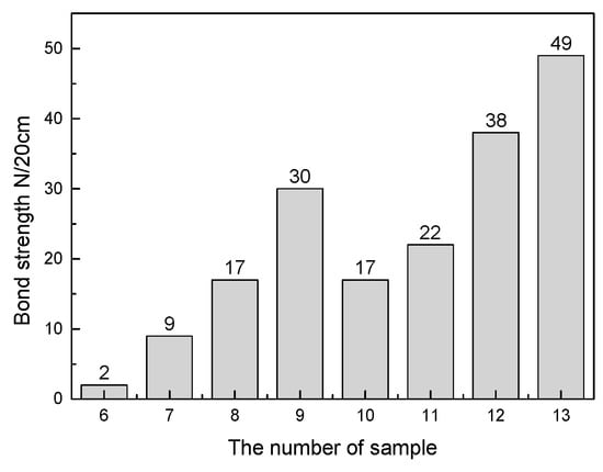The KCl and ZnFe2O4 bond strength test results are presented in Figure 10. The bond strength of the sample increased as the KCl and Fe2O3 contents increased. Among them, since the content of KCl was only 5% in sample 6, the sample itself had unbonded powder. Consequently, the bond strength performance was quite low. From the latter, it could be observed that the cohered phase was the ZnFe2O4, when the Fe2O3 was added to the ZnO and PbO powder matrix. From the experimental results, the bonding effect of ZnFe2O4 was significantly improved compared to KCl. When the KCl content was 15%, the bond strength was 17 times/20 cm, while the ZnFe2O4 was used as the cohered phase. When the Fe2O3 content reached 10%, the bond strength reached 17 times/20 cm. Figure 11 presents the bonding methods of KCl and ZnFe2O4, respectively. This was due to different ZnFe2O4 particle growths to form a macroscopic porous structure, while the other particles were embedded in the hole. Also, in the formation of ZnFe2O4, a part of the bonded phase was consumed as the ZnO changed into a binder phase. In other words, each micro-ZnFe2O4 particle adhered to the solid particles in a lower amount compared to KCl bonded particles. Consequently, the performance of ZnFe2O4 bonding was stronger than KCl. By contrast, in the actual deposition formation, since the formation of ZnFe2O4 was a solid-solid reaction, the material for the deposition immobilization on the wall of the heat exchanger was KCl. The KCl content in the deposition was approximately 22%, whereas when the KCl content reached 20%, the sample bond strength was 30 times/20 cm, indicating that the KCl existence in the deposition was sufficient to fix the deposition on the wall of the heat exchanger. The KCl bonded other phases through the liquid to solid transition, while the ZnFe2O4 produced a porous structure to fix the other solid particles. The ZnFe2O4 was a solid phase that could not self-immobilize along with other substance particles on the heat exchanger walls. Therefore, the KCl was considered as the main cohered phase and the ZnFe2O4 was the secondary cohered phase.