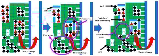 Through Chapters 3.1 and 3.2, two types of cohered phases were identified, namely the KCl and ZnFe2O4. The bonded phases were ZnO, PbO and the iron-containing particles. Therefore, it could be inferred that the formation mechanism of the deposition product was: (1) the KCl solidified on the heat exchanger wall, while the iron-containing particles, as well as the ZnO and PbO particles would be bonded with KCl during the KCl solidification. Since the iron-containing particle sizes exceeded the ZnO and PbO sizes, the iron-containing particles would remain on KCl earlier than the ZnO and PbO deposition. (2) the ZnFe2O4 was formed following the contact with ZnO and Fe2O3, while different ZnFe2O4 phases grew to form the porous structure. (4) the KCl in the porous structure continued to solidify and bond other dust particles, for the hole to be filled; (5) When the hole was filled, the formations of gray flat and transition areas occurred, not being completely filled, while retaining the porous area morphology. The process of deposition formation is presented in Figure 12.