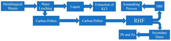 - Peng, C.; Zhang, F.L.; Li, H.F.; Guo, Z.H. Removal behavior of Zn, Pb, K and Na from cold bonded briquettes of metallurgical dust in simulated RHF. ISIJ Int. 2009, 49, 1874–1881. [Google Scholar] [CrossRef]
