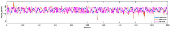 - In comparison with the results of the other two algorithms, the three indicators of the VMD–SVR algorithm are significantly better than those of the other two algorithms. The RMSE index is improved by 36.1%, the MAPE index are improved by 37.5%, the R is improved by 3%, and the MAE index is improved by 37.6%;
