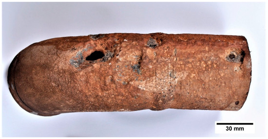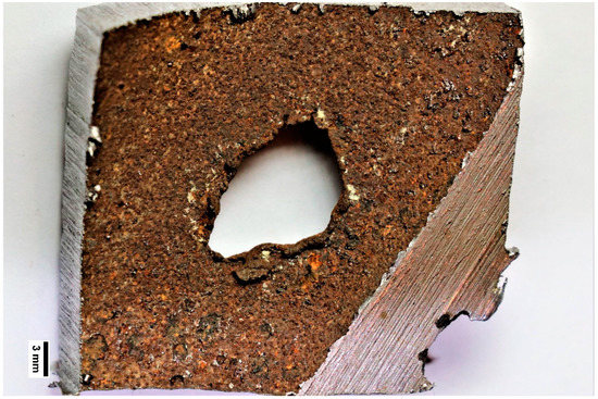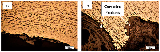 The corroded tube was also cultivated in the media. The results revealed that due to reactivation and reproduction of SRB, the amount of corrosion products increased. The corrosive effects of SRB are shown in Figure 14. The redox potentials of as-received soil before inoculation in an SRB-specific medium and that after inoculation were 19 and −315 mV, respectively. The decrease in the redox potential can be attributed to the enhanced activity of SRB, which is in accordance with the presented results of Figure 11, Figure 12 and Figure 13 [23,24].