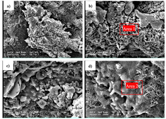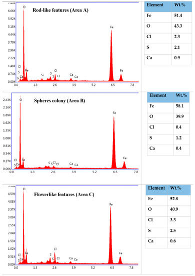 Figure 9 shows SEM images of corrosion products at the inner surface. As mentioned earlier, there was hardly any sign of localized corrosion. The inner surface in some areas was covered with a porous scale-like layer intermingled with some globular α-FeOOH particles, see Figure 9a,b. Other observed morphologies of corrosion products were plate-like micaceous crystalline features, see Figure 9c, and honeycomb-like structures, see Figure 9d, with both being typical morphologies of γ-FeOOH. Therefore, overall, the inner surface was covered with different iron oxide-hydroxides and possibly other oxide products. Figure 10 shows the EDS analysis of the areas shown in Figure 9. There was no sign of sulfur and chloride, unlike what was seen at the outer surface. It appears that the failure has started from the outer pipe surface, and corrosion products at the inner surface were caused by the liquid inside the pipeline.