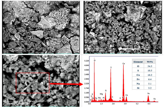 Figure 7 represents a closer look at the biofilm in the outer surface in which microorganisms are distributed. Biofilm is a self-produced firmly-attached EPS surface layer. In fact, the stability of microorganisms is dependent on the biofilm, given that the biofilm provides structural support for microorganisms and, to a great extent, protects them from environmental, physical, and chemical stresses. Biofilms could host a variety of different microorganisms including fungi, bacteria, eukaryotes, and archaea, with each having a different metabolic ability [2]. The SRB, in particular, has a vigorous metabolism, producing a certain amount of EPS (in fact, often there are also other microorganisms present that are mainly responsible for EPS production), which rapidly adhere to the surface of the metal and build a biofilm [14,18]. The biofilm, in this case, has a porous nature, making the ion/nutrition exchange much easier. EPS are composed of charged polymers and can significantly contribute to the accumulation of different chemical species inside EPS. In the case where organic acids are produced by microbial species, mineral dissolution rates are expected to increase [19,20]. The results of EDS analysis show that elements oxygen, sulfur, calcium, chloride, and iron were present in the biofilm. Figure 8 shows typical XRD patterns of corrosion products, taken from the surface of the pipe. The results confirmed the formation of a significant amount of oxide-hydroxide (FeOOH), iron oxide, and iron sulfide. The latter is a typical corrosion product when SRB is the controlling microorganism.