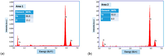 EDS analyses of (a) area 1 and (b) area 2, shown in Figure 9.
