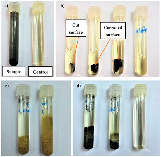 SRB growth monitoring in specific media after 20 days. Control: The specific medium without inoculation. (a) Surface scratch from corrosion tube, (b) the corrosion tube cuts (c) the soil samples of corrosion area after five days, and (d) after 20 days.