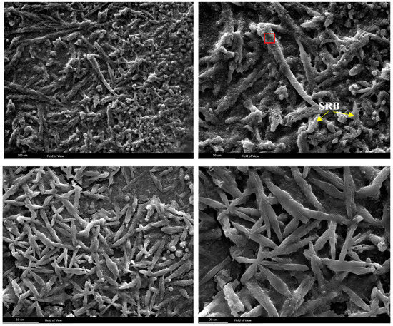 Some sulfate-reducers can oxidize methane in anaerobic reactions. Another unique characteristic of SRB is its ability to survive when exposed to oxygen, even though its growth is inhibited in such a case. It is worth mentioning that the spherical geometry of particles might be an indication of the presence of iron (II) carbonate (FeCO3) surrounded by a mixture of iron oxides and iron sulfide (FeS). From an engineering point of view, the importance of microorganisms’ nature is that they have quite a large variation in size. They are also homogeneously distributed, potentially very fast-growing, and they have significantly grown with perceivable restraints in nutrient availability induced by an overpopulating of microorganisms [11,17].
