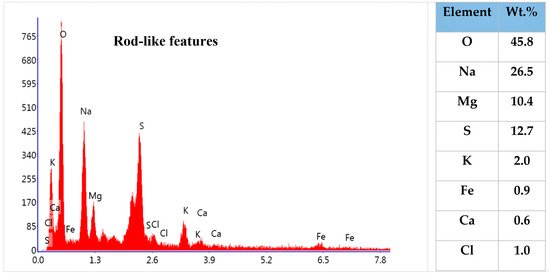 Figure 6 shows the results of EDS analyses of rod-like, spherical, and flowerlike corrosion products. In terms of the chemistry, there was no meaningful difference between these features, inferring that the difference between these features is only morphological. The presence of sulfur in all the EDS spectra is an indication that the observed features are SRB, which is an anaerobic bacterium. SRB is known to be the primary factor of MIC. Organic compounds attracted to the surface of steel make it an ideal environment for the colonization of microorganisms [2]. Amongst different microorganisms, SRB is known to have excellent adaptability to extreme conditions. Biochemical energy for the growth of SRB is obtained by reducing sulfate (SO4−2) to sulfide (S−2) in the presence of natural organic compounds. At the same time, with the absorption of atomic hydrogen (H) on the surface of iron, it will gradually disappear [16]. Overall, the major detrimental metabolic activities of SRB are mostly related to its ability to: