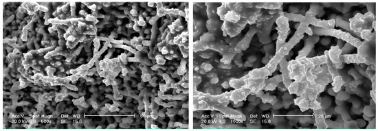 Surface scratches from the corroded elbows and samples of soil from the corrosion area were inoculated in SRB-specific media and incubated in anaerobic conditions for 20 days. As shown in Figure 11, the black precipitation is created due to SRB growth and H2S and FeS production in the media. It is noticeable that the SRB-induced black precipitation was only created on the corroded surface of the failed elbow, and there was no sign of black precipitation on the cut surface, see Figure 11b. The formation of SRB cells was confirmed by SEM images, see Figure 12, and EDS spectra, see Figure 13. SRB is resistant to environmental stresses such as pH and temperature variations, chloride concentration, and high values of pressure. They form biofilms and create massive corrosion products by deteriorative mechanisms [21,22].