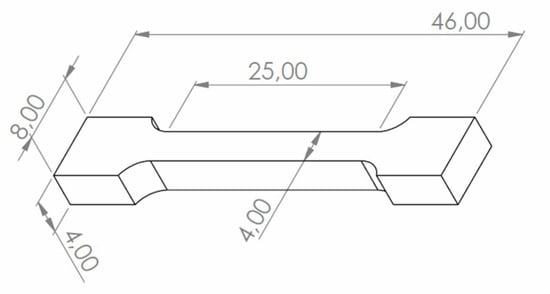 Alloys consisting of Sn58Bi and Sn57.6Bi0.4Ag were provided by Henkel (Hemel Hempstead, UK). The alloy was melted in a stainless steel crucible at 450 °C, and then it was chill cast in a custom designed stainless steel mold at room temperature to form a thick dog-bone shaped ingot. The ingot was then sliced into tensile specimens of 2 mm thickness, as shown in Figure 1. The as-cast solder alloys were cross-sectioned, metallographically polished, and examined using a TM1000 scanning electron microscope (SEM, Hitachi, Tokyo, Japan) operated at an accelerating voltage of 1.5 kV in backscattered electron (BSE) mode.
