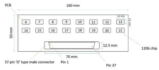 Solder pastes were produced utilizing a rosin-based flux. Commercial Sn37Pb solder paste was used in this study as a control. As shown in Figure 2, dummy components comprising 16 of 1206 chip resistors were soldered with these pastes on an FR4 printed circuit board (PCB) with a Cu organic solderability preservative (OSP) surface finish. The PCB was 1.55 mm thick and consisted of two layers. A standard right angle 37-pin D-type male connector was used to connect the PCB to an external data logger.
