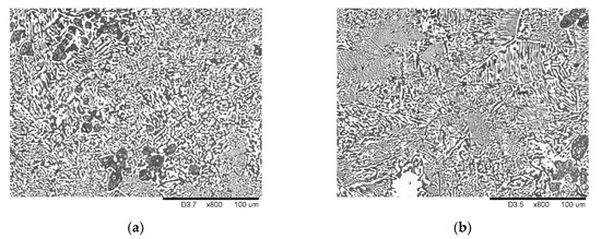 Microstructure at lower magnification (×800): (a) Sn58Bi and (b) Sn57.6Bi0.4Ag.